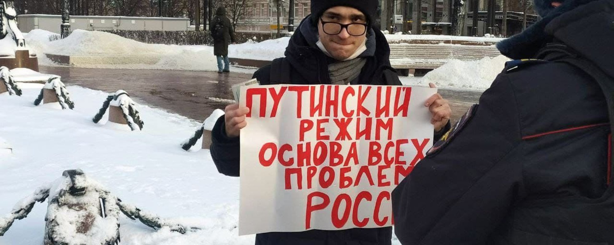 Хабибуллин стоял с плакатом «Путинский режим — основа проблем в России», а Бучельников — просто с географической картой России.