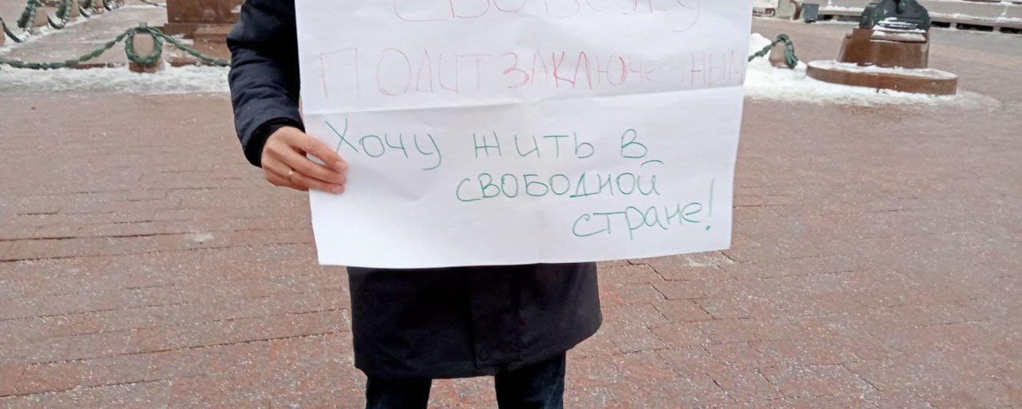 Активисты по очереди стояли с плакатами «Свободу политзаключенным. Хочу жить в свободной стране» и «Я против пыток и репрессий в России». Их имена пока неизвестны.