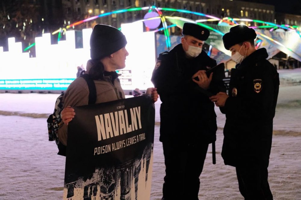 Балашов стоял на площади Советов с постером фильма о Навальном, который выпустили американские компании CNN Films и HBO Max.