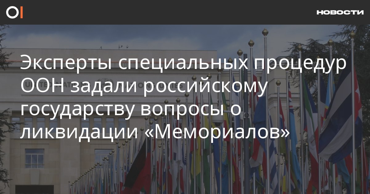 Представители специальных процедур Совета по правам человека ООН опубликовали направленные властям Российской Федерации вопросы о ликвидации историко-культурных и правозащитных организаций — Международного Мемориала и Правозащитного центра «Мемориал». Сообщение опубликовано на их сайте.