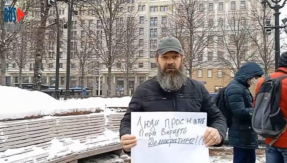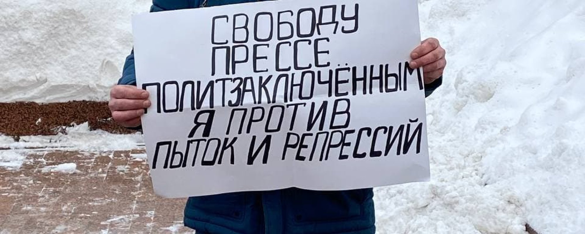 Агаршев держал плакат «Свободу прессе, политзаключенным, я против пыток и репрессий», а Воронцов — «Люди, проснитесь, пора вернуть демократию!»