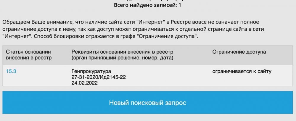 Согласно информации на сайте РКН, требование Генпрокуратуры было составлено 24 февраля 2022 года, в первый день начала специальной операции — то есть более чем за две недели до блокировки.