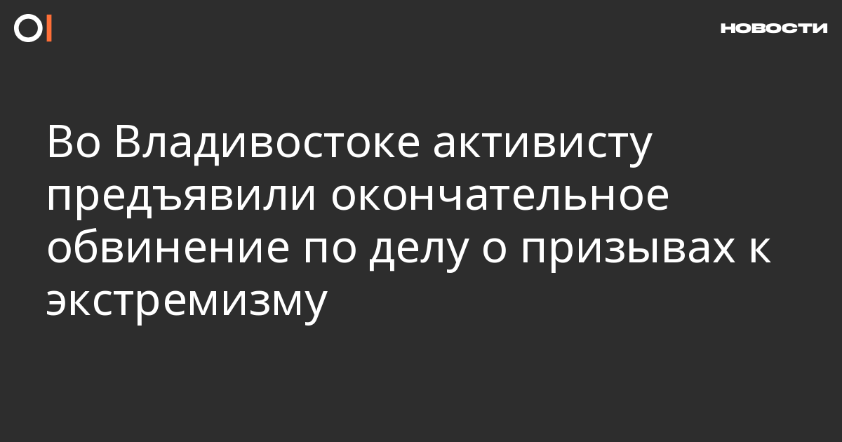 12 апреля во Владивостоке следствие предъявило окончательное обвинение местному активисту Роману Беломестнову по статье о призывах к экстремизму в интернете (ч. 2 ст. 280 УК). Об этом сообщает Activatica.