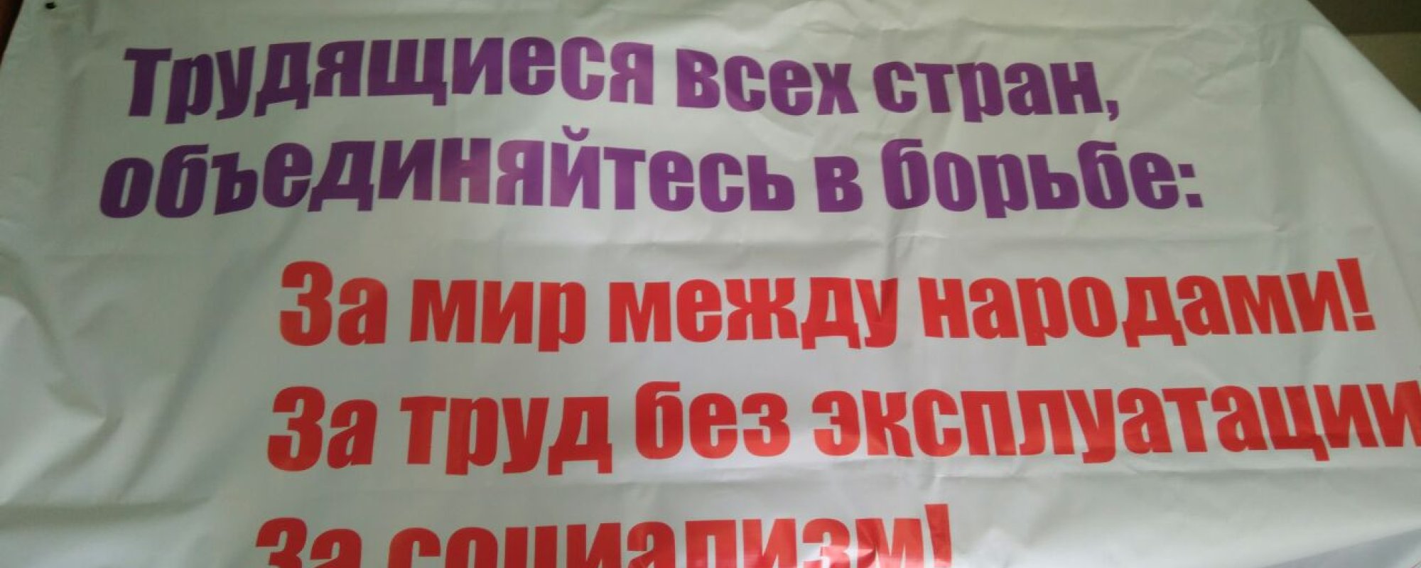 Они держали баннер с обращением к трудящимся всех стран. Кроме того, у них были плакаты за свободу собраний.