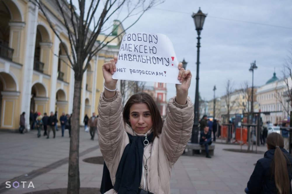 Девушка вышла к Гостиному двору с плакатом «Свободу Алексею Навальному! Нет репрессиям!». При задержании полицейские отказались представиться и силой затолкали активистку в автозак.