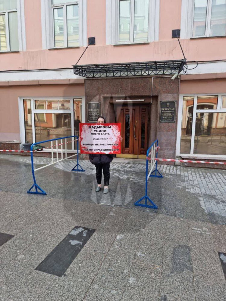 Девушка вышла в одиночный пикет с плакатом «Кадыровы убили моего брата 15.08.2021 года. Убийцы не арестованы. Требую справедливости».