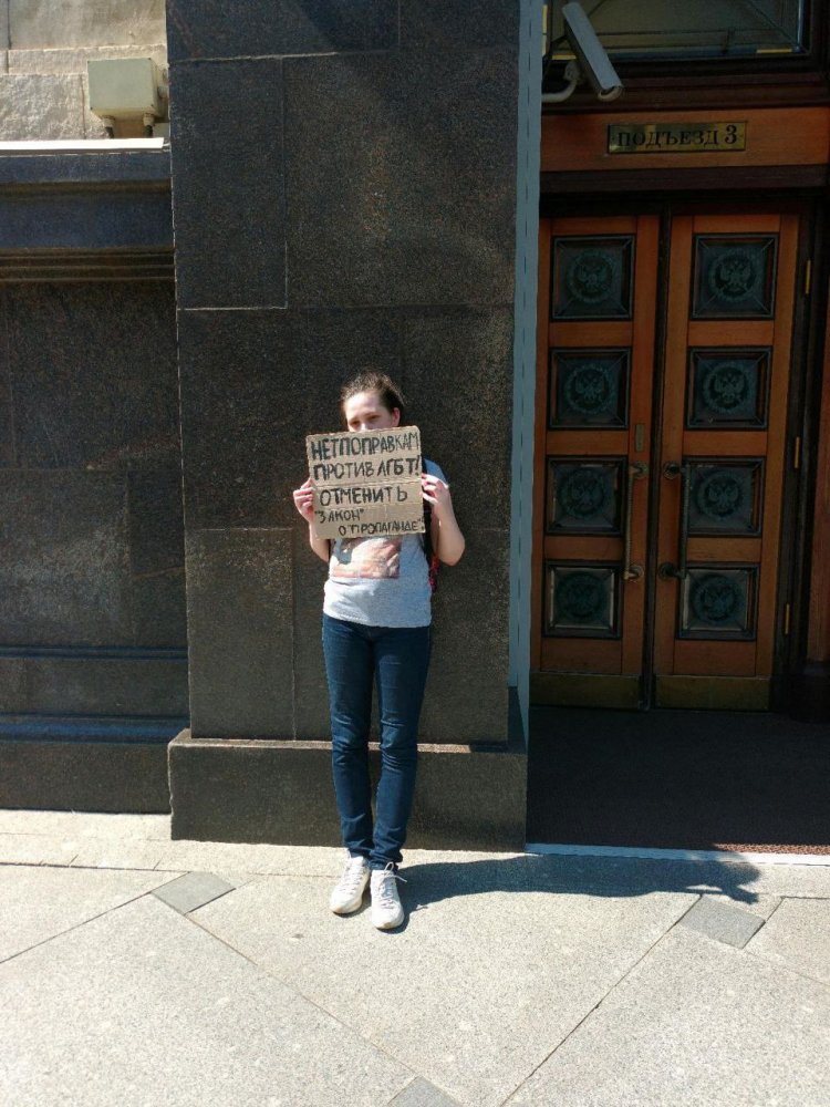 В Москве задержали и уже отпустили Анастасию Подгорнову, которая пикетировала с плакатом «Нет поправкам против ЛГБТ. Отменить закон о пропаганде!». Об этом ОВД-Инфо сообщила сама задержанная.