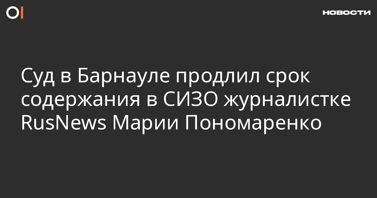 В Барнауле Октябрьский районный суд продлил журналистке RusNews Марии Пономаренко, обвиняемой по делу о «фейках» про армию РФ, срок содержания в СИЗО до 28 августа. Об этом сообщается в телеграм-канале издания.