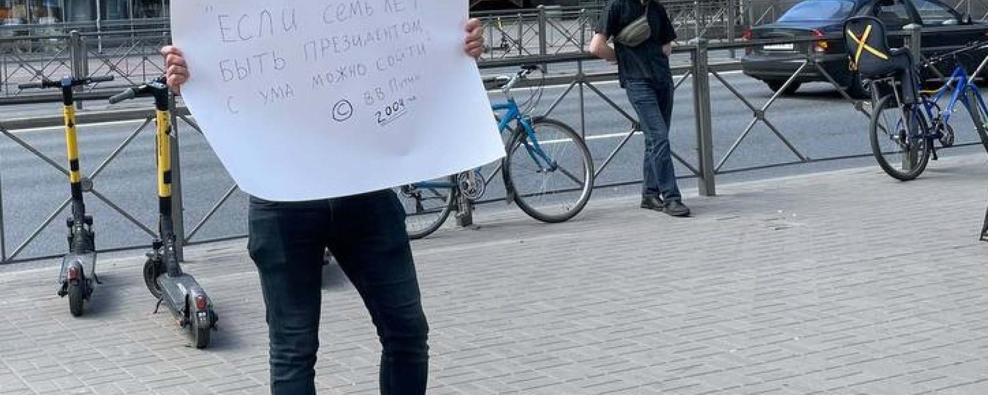 В Петербурге задержали Андрея Оливьери, проводившего одиночный пикет с высказыванием, которое Владимир Путин сделал в 2004 году: «Если семь лет быть президентом, с ума можно сойти». Об этом ОВД-Инфо сообщила жена задержанного.