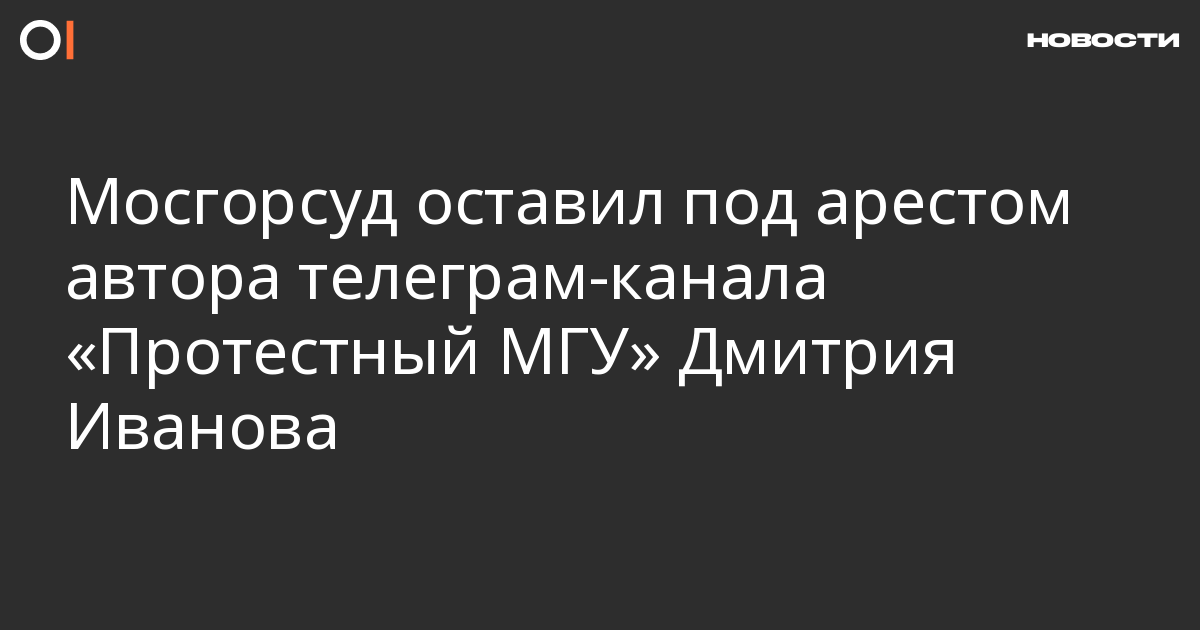 Мосгорсуд отклонил апелляционную жалобу на арест автора телеграм-канала «Протестный МГУ» Дмитрия Иванова, обвиняемого по статье о распространении «фейков» про российскую армию (п. «д» ч. 2 ст. 207.3 УК). Об этом сообщает Avtozak LIVE.
