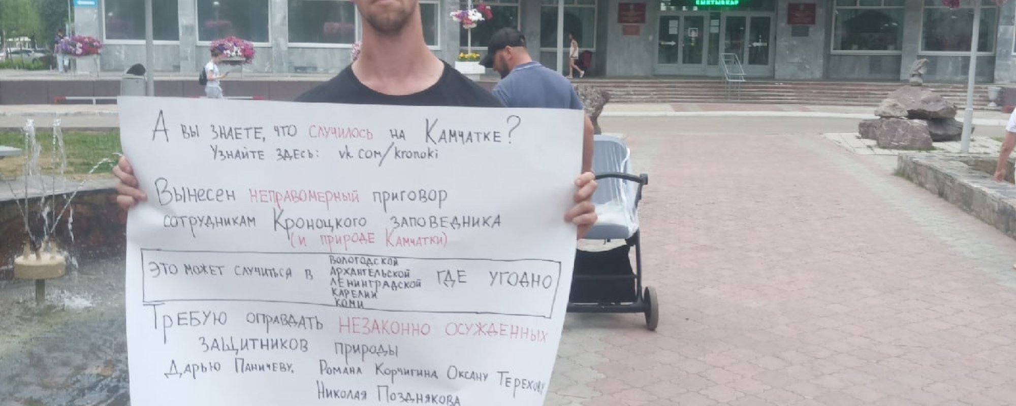 18 июля у здания администрации Сыктывкара полицейские задержали научного сотрудника Дарвиновского заповедника Вологодской области Дмитрия Садокова из-за пикета в защиту его осужденных коллег из Кроноцкого заповедника на Камчатке. Об этом сообщается в группе «Против захвата озер» во «ВКонтакте».