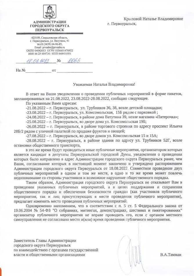 Городская администрация Первоуральска (Свердловская область) 18 августа не согласовала агитационные пикеты кандидатке в депутаты местной гордумы Наталье Крыловой. Об этом сообщают «Вечерние ведомости».