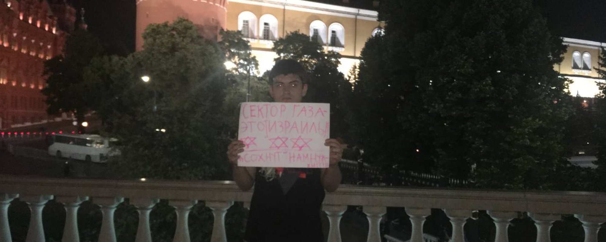 Молодой человек провел свой пикет возле памятника Жукову. На своем плакате он написал «Сектор Газа — это Израиль. Сохнут нам нужен». Суслина пока что никуда не доставили.