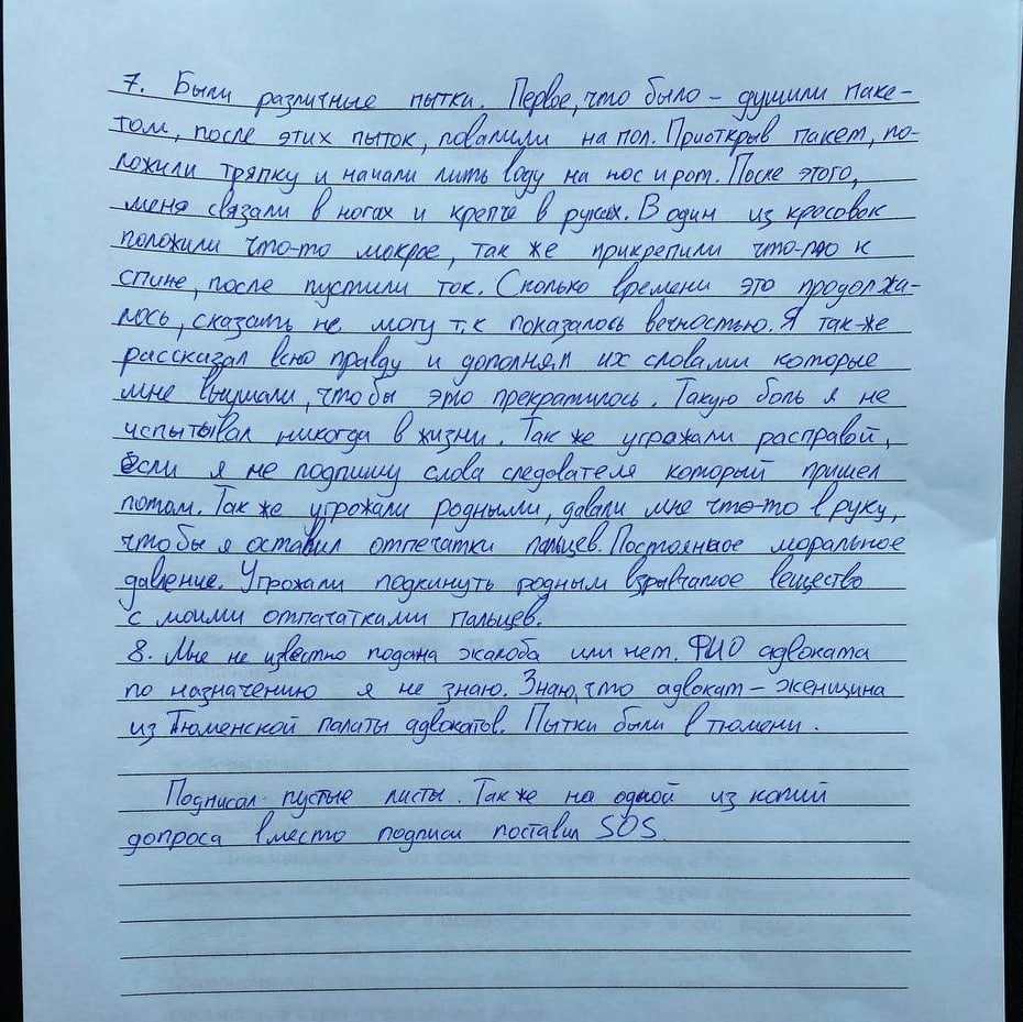 «Были различные пытки душили пакетом, после этих пыток повалили на пол, — рассказал Незнамов своему адвокату. — Приоткрыв пакет, положили тряпку и начали лить воду на нос и рот. После этого меня связали в ногах и крепко в руках. В один из кроссовок положили что-то мокрое, также прикрепили что-то к спине, после пустили ток. Сколько времени это продолжалось, сказать не могу, т.к показалось вечностью. Я также рассказал всю правду и дополнял их словами, которые мне внушали, чтобы это прекратилось. Такую боль я не испытывал никогда в жизни».