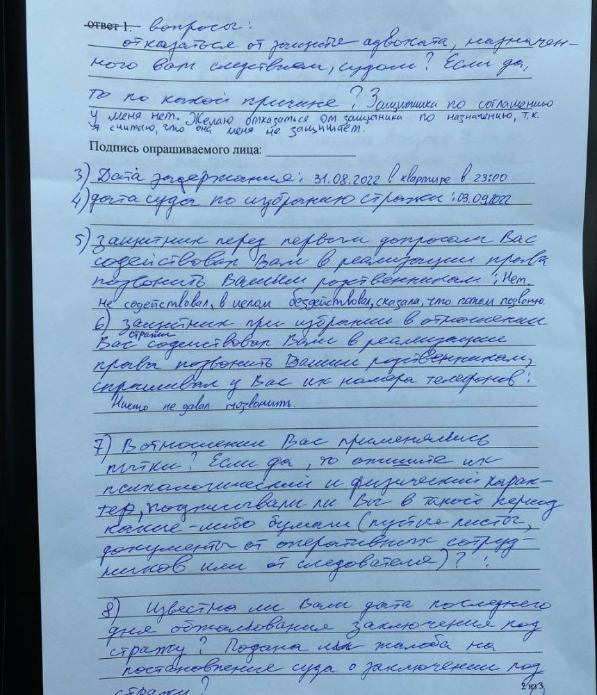 По словам Незнамова, от него требовали подписать пустые листы и некие «слова следователя» и угрожали, что родственникам молодого человека подбросят взрывчатое вещество с его отпечатками пальцев. В итоге он подписал бумаги, а на одной из копий допросам он вместо подписи поставил знак SOS.