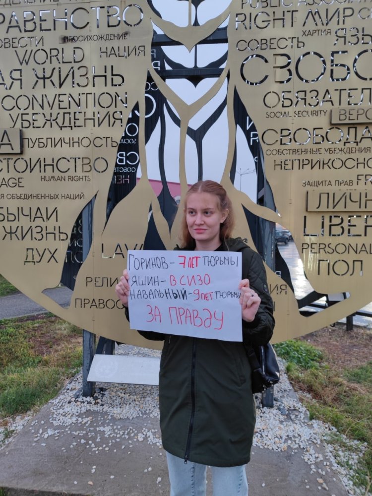 Султангареева стояла около стелы, посвященной Всеобщей декларации прав человека, с плакатом «Горинов — 7 лет тюрьмы; Яшин — в СИЗО; Навальный — 9 лет тюрьмы. За правду».