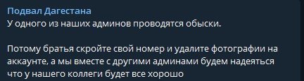 К одному из администраторов телеграм-канала «Подвал Дагестана» пришли с обыском. Публикация об этом появилась в 21:43 в самом канале.