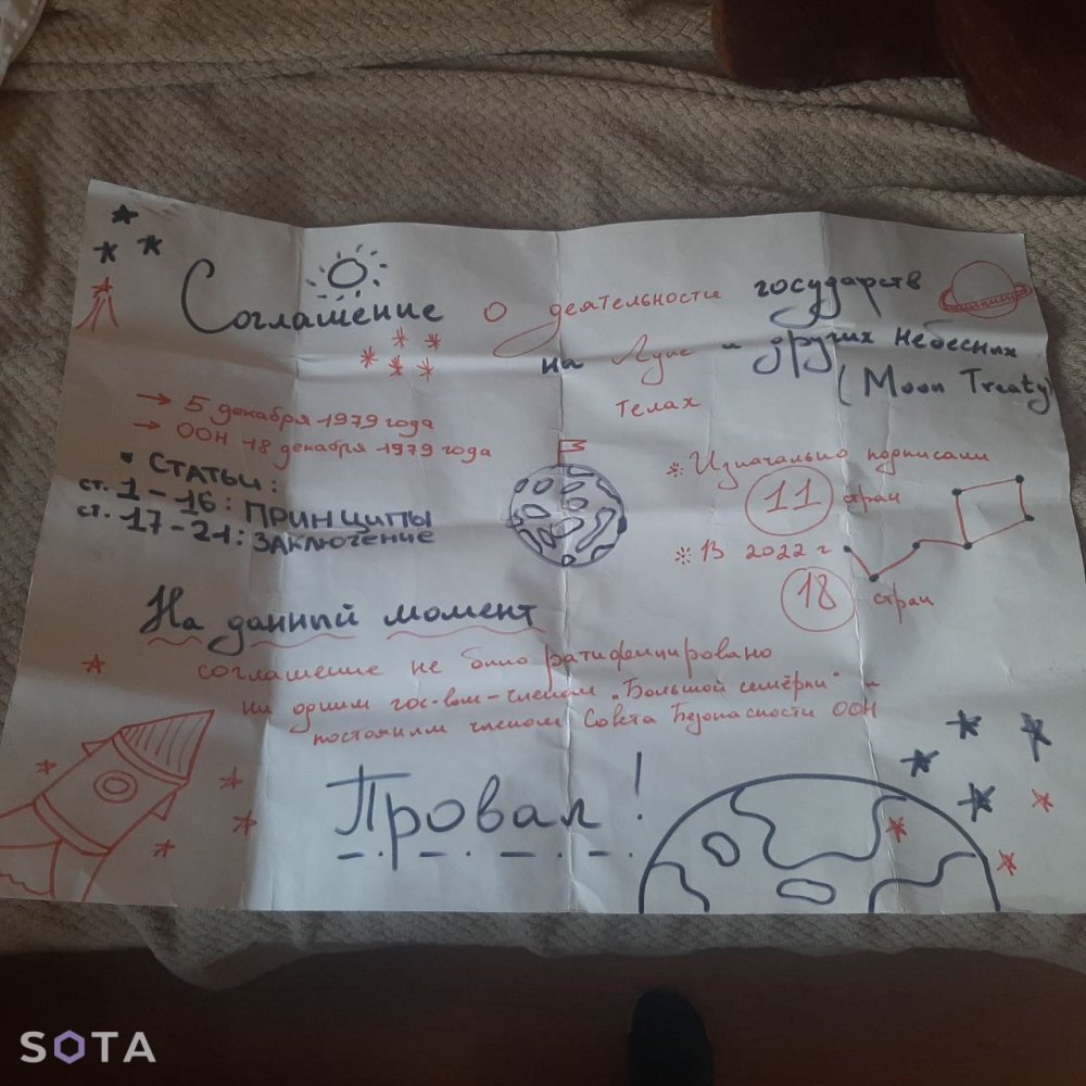 Полицейские задержали студентку возле метро «Чистые пруды», когда она возвращалась из университета в общежитие. Ее учебная работа, выполненная на ватмане, была посвящена международному праву. Текст был озаглавлен «Соглашение о деятельности государств на Луне и других небесных телах (Moon Treaty)».