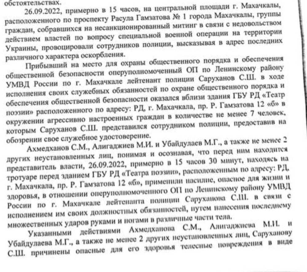 Согласно материалам дела, по которому проходят Ахмедханов, Алигаджиев и Убайдулаев, на акции 26 сентября они нанесли телесные повреждения сотруднику полиции. В последствии у силовика якобы диагностировали закрытую черепно-мозговую травму, сотрясение головного мозга и ушибы мягких тканей.