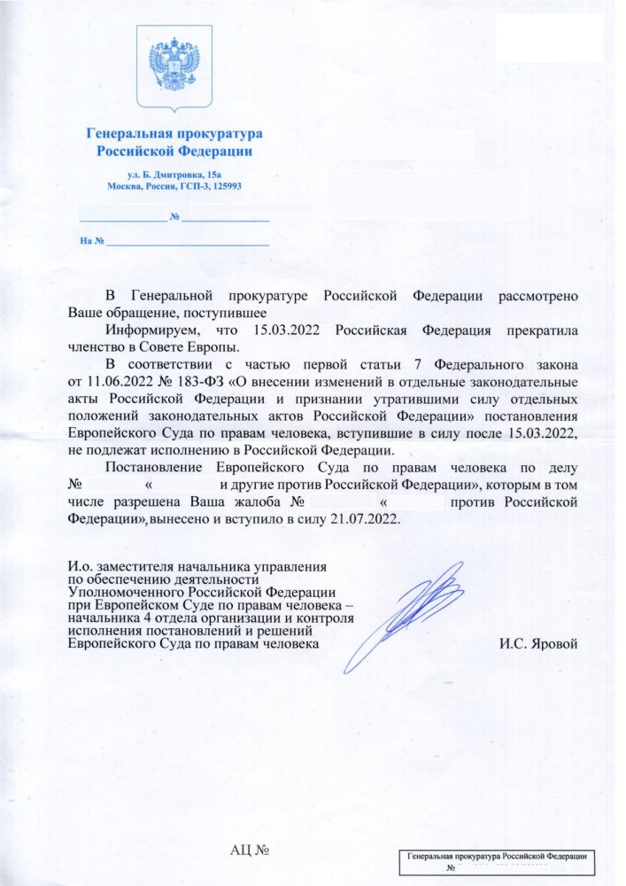 В отказе Генпрокуратура сослалась на федеральный закон, якобы позволяющий не исполнять решения ЕСПЧ, вынесенные после 15.03.2022.