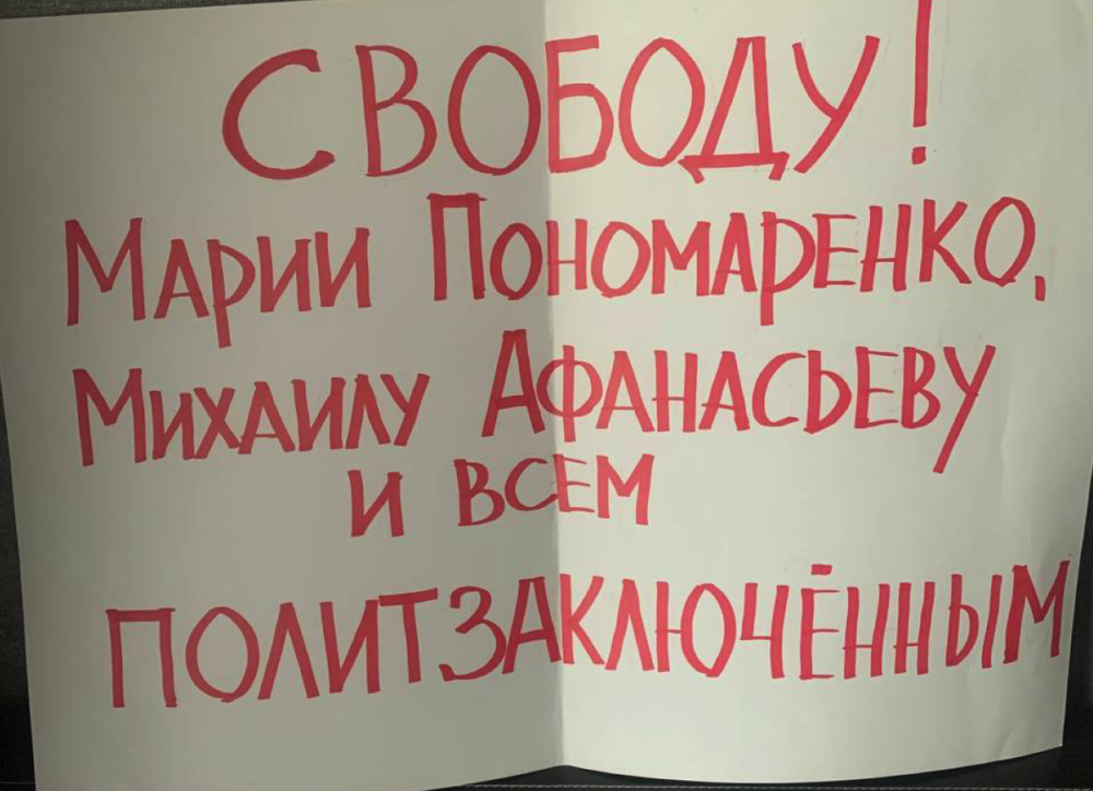 На плакате Андрющенко была надпись «Свободу! Марии Пономаренко, Михаилу Афанасьеву и всем политзаключенным!». Сейчас он находится в ОМВД по Тверскому району Москвы.