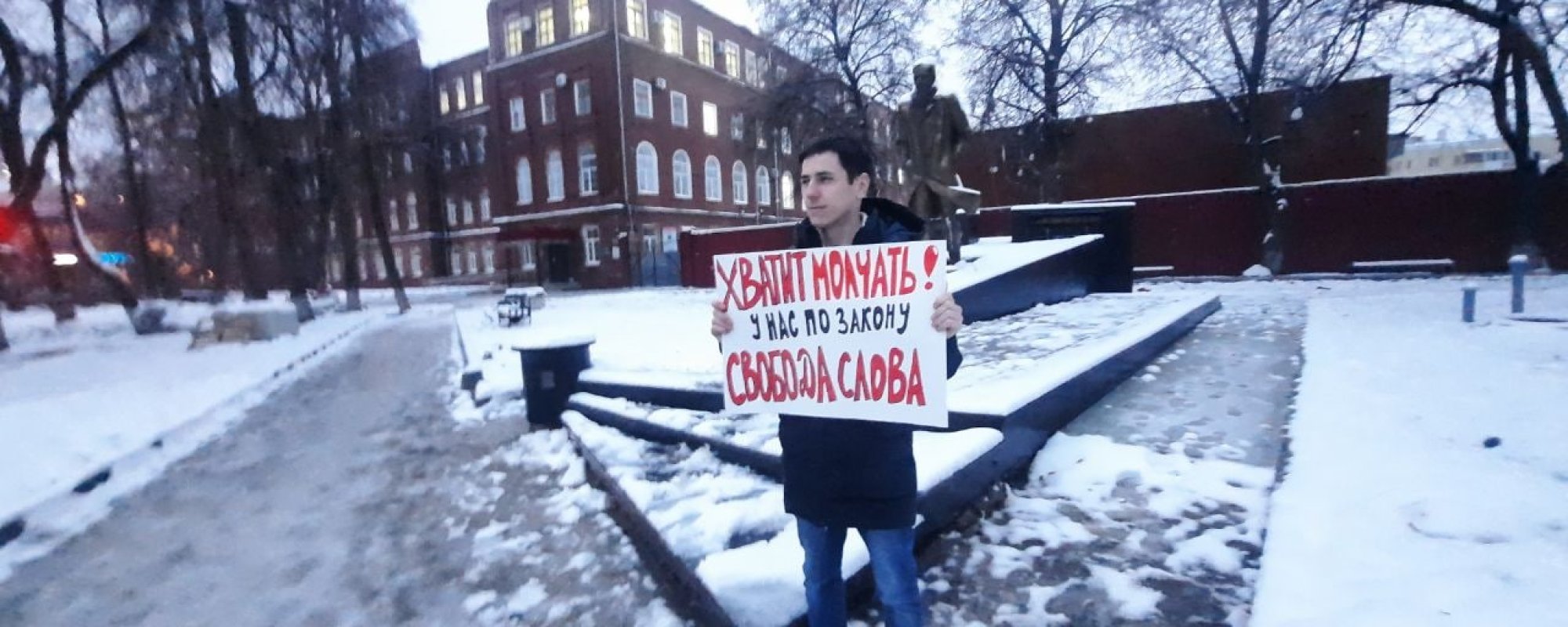 В Воронеже задержали активиста, который вышел в одиночный пикет в защиту свободы слова. На плакате у активиста был текст: «Хватит молчать! У нас по закону свобода слова». В настоящий момент он уже отпущен на свободу. Об этом сообщает телеграм-канал «Ворнадзор Против Войны и Мобилизации».