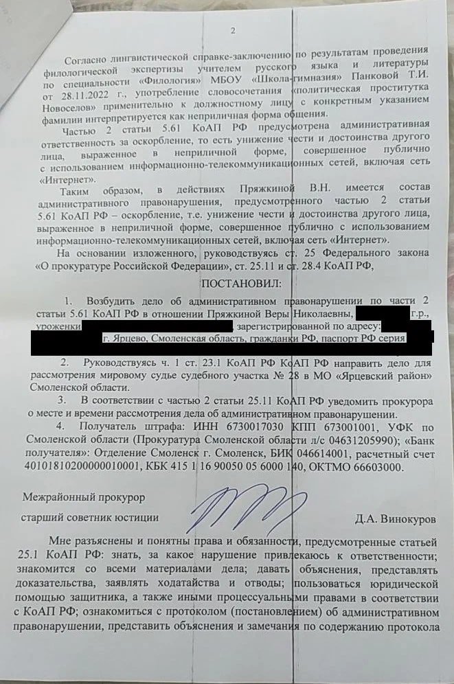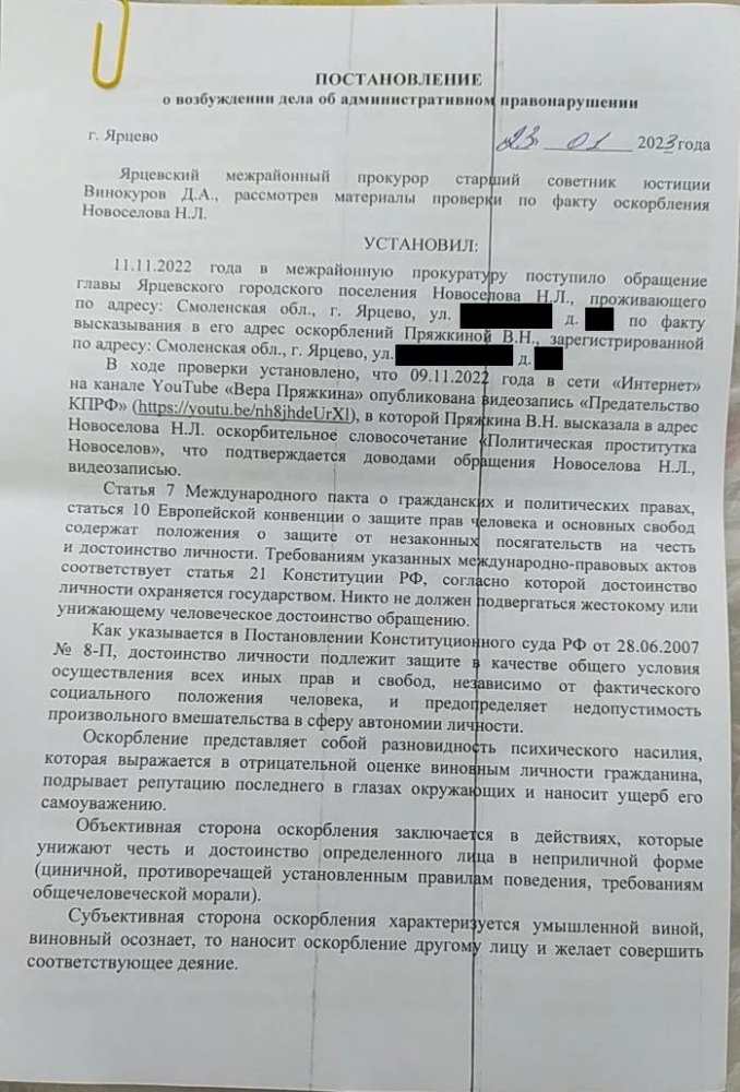 Прокуратура города Ярцево в Смоленской области завела административное дело об оскорблении в отношении активистки и экс-депутата горсовета Веру Пряжкину из-за ролика на ютуб, в котором она назвала главу города «политической проституткой». Об этом Пряжкина рассказала на своей странице в «Яндекс.Дзен», на пост обратило внимание «7×7».