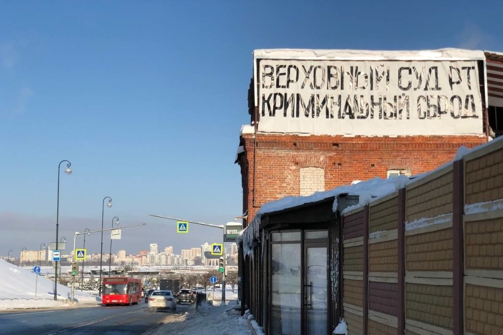 Баннер о Верховном суде РТ Хайруллин вывесил год назад после штрафа из-за прорубленной в стене кафе двери. Тогда строительство пристройки к историческому дому власти согласовали, поэтому казанец посчитал, что его оштрафовали необоснованно.
