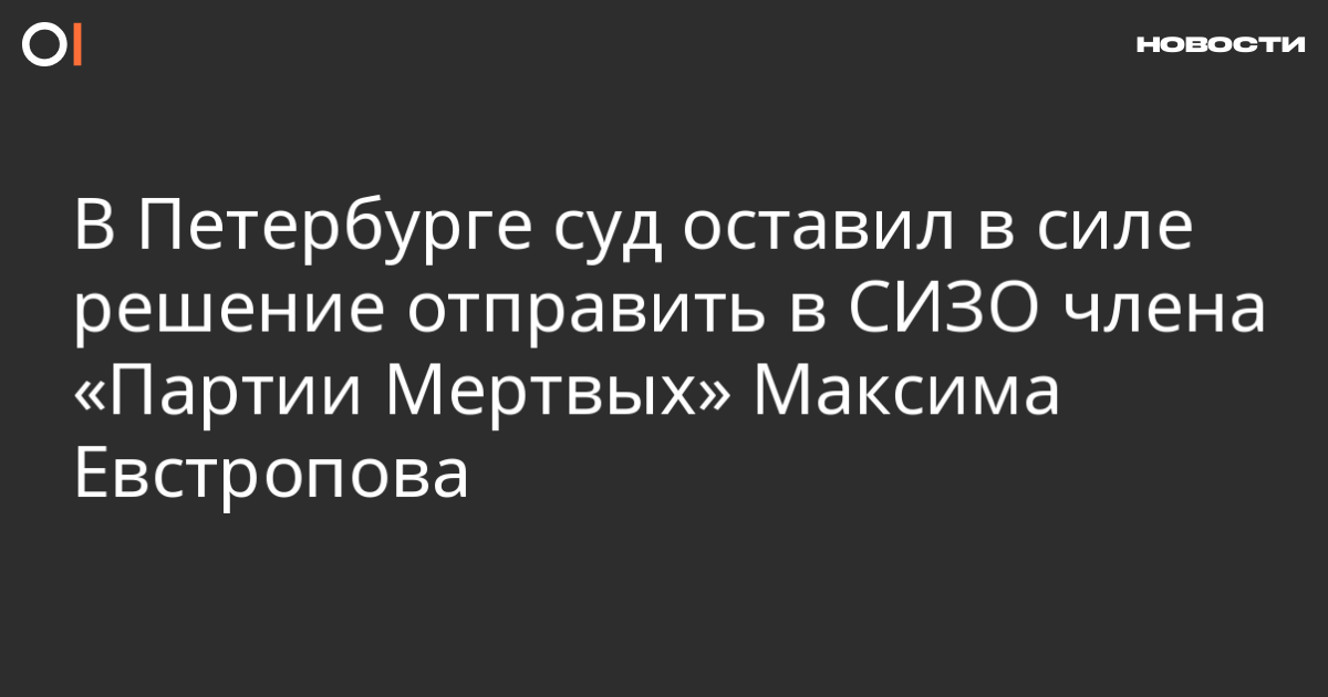 Санкт-Петербургский городской суд оставил в силе решение заключить под стражу основателя арт-группы «Партия мертвых» Максима Евстропова. Об этом сообщает в телеграме объединенная пресс-служба судов Санкт-Петербурга.