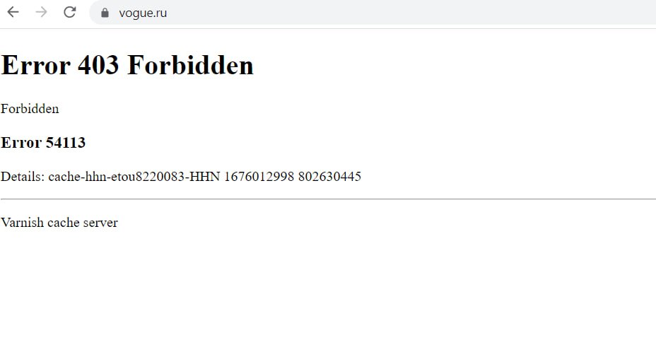 В настоящий момент в реестре заблокированных сайтов Роскомнадзора нет ссылок ни на интервью, ни на сайт российской версии Vogue. Однако страницы все равно не открываются, по ссылке появляется ошибка 403, как правило означающая, что доступ к запрошенному ресурсу запрещен.