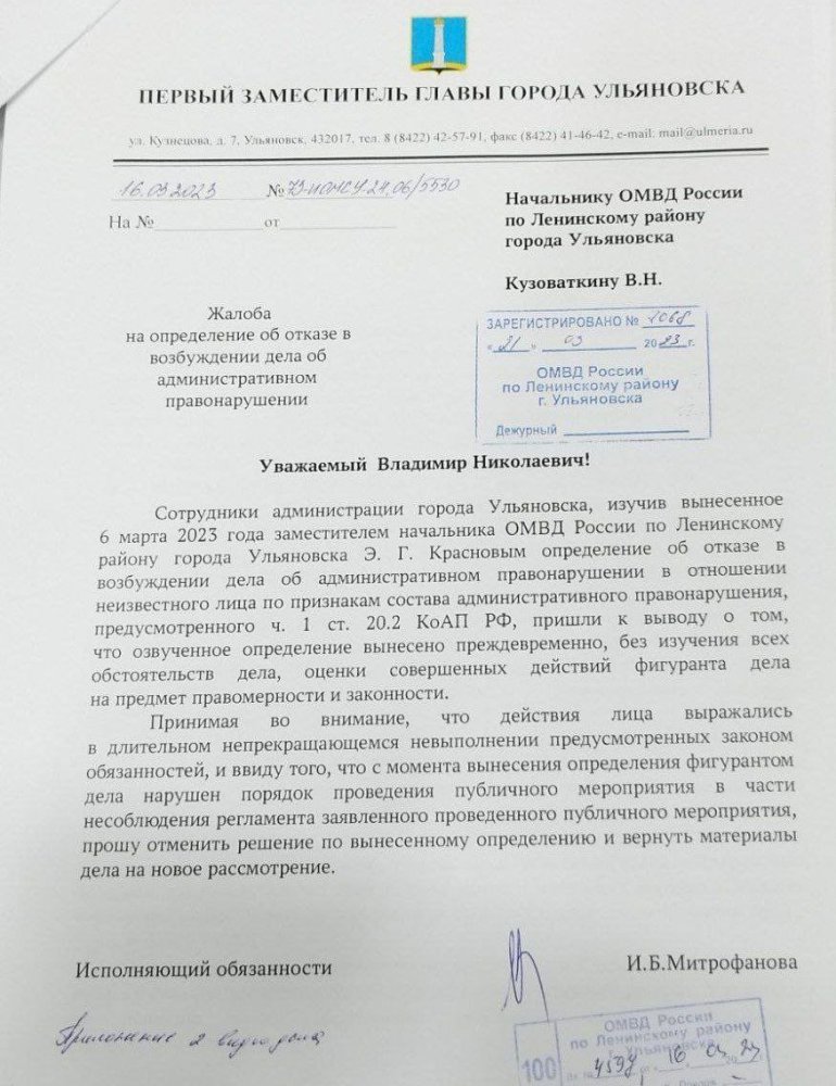 В Ульяновске 27 марта полиция составила протокол по статье о нарушении порядка проведения акции (ч. 1 ст. 20.2 КоАП) на Константина Толкачева — организатора митинга за возврат прямых выборов главы города. Об этом он сообщил в своем телеграм-канале.