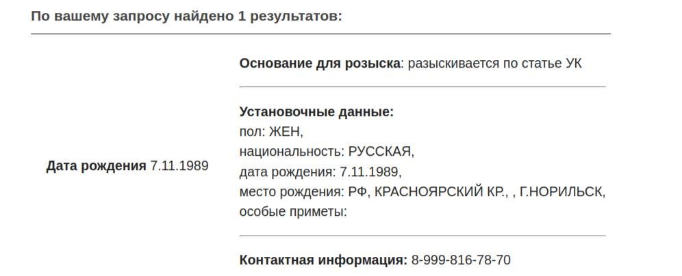 Карточка МВД по запросу: Надежда Толоконникова, 1989 г. р.