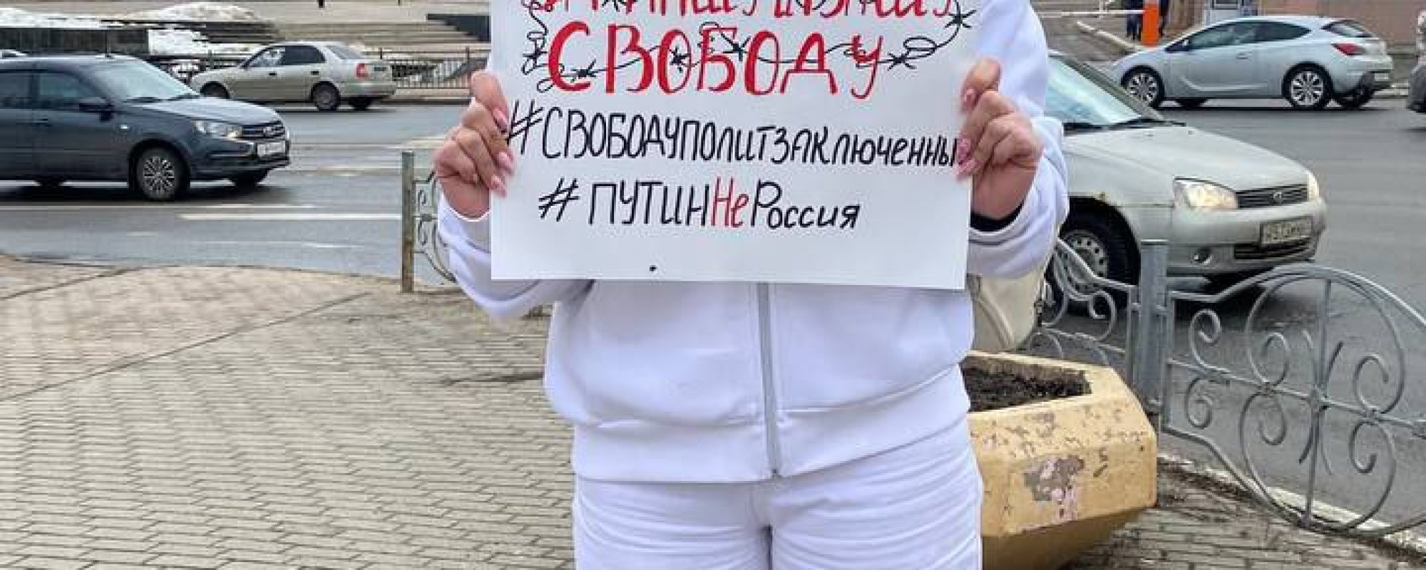 На плакате Левашовой было написано «За нашу и вашу свободу #СвободуПолитзаключенным #ПутинНеРоссия».