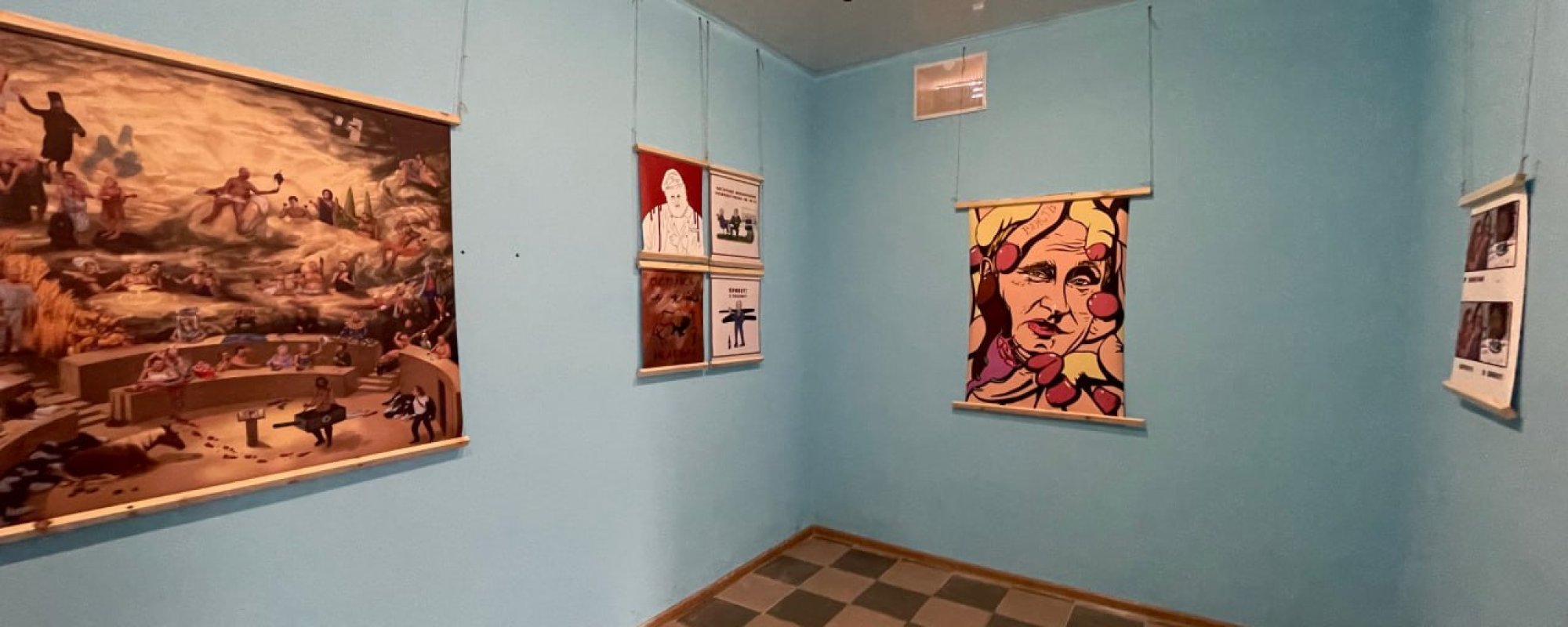 22 апреля в городе открылась антивоенная выставка с картинами Семкина. Арендодатель помещения, где проходила выставка, придерживается провоенных взглядов, и, узнав о ее тематике, решил вызвать полицию из-за трещины на окне (Семкин утверждает, что окно было разбито еще до открытия выставки). После этого матери и отцу художника начали звонить полицейские.