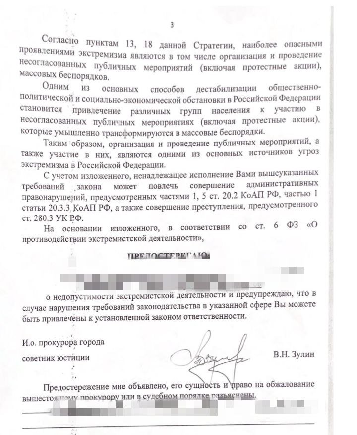 В предостережениях прокурор ссылается на «Стратегию противодействию экстремизму в РФ до 2025 года» и утверждает, что несогласованные акции протеста — «наиболее опасные проявления экстремизма». А «привлечение» к участию в них — один из основных способов дестабилизации общественно-политической обстановки в России, который затем «умышленно трансформируется в массовые беспорядки».