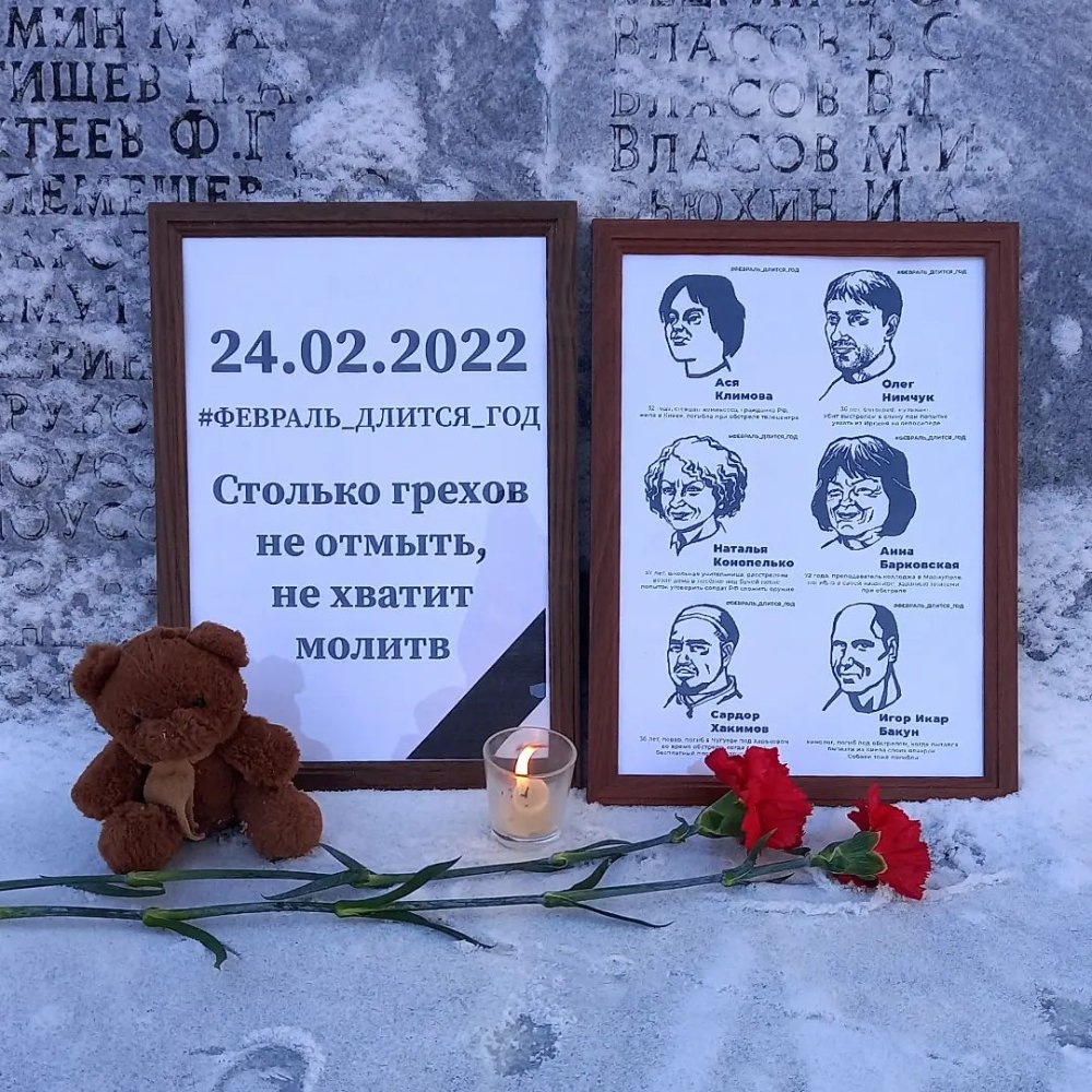 В годовщину начала полномасштабной войны девушка создала у памятника героям гражданской войны в Арамиле неофициальный мемориал. Она принесла туда гвоздики, свечу, игрушечного медведя и рамки, внутри которых были портреты погибших украинцев и надпись «Февраль длится год. Столько грехов не отмыть, не хватит молитв». Фотографию она опубликовала в своем инстаграме.