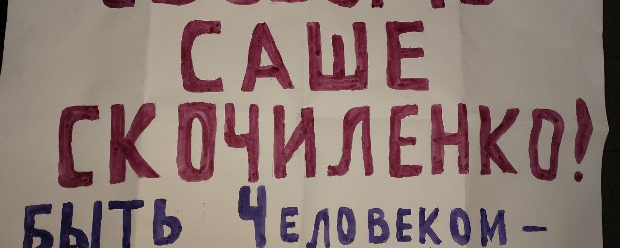 С пикетчиком провели беседу сотрудники Центра «Э», а также изъяли у него плакат в поддержку заключенной Саши Скочиленко.
