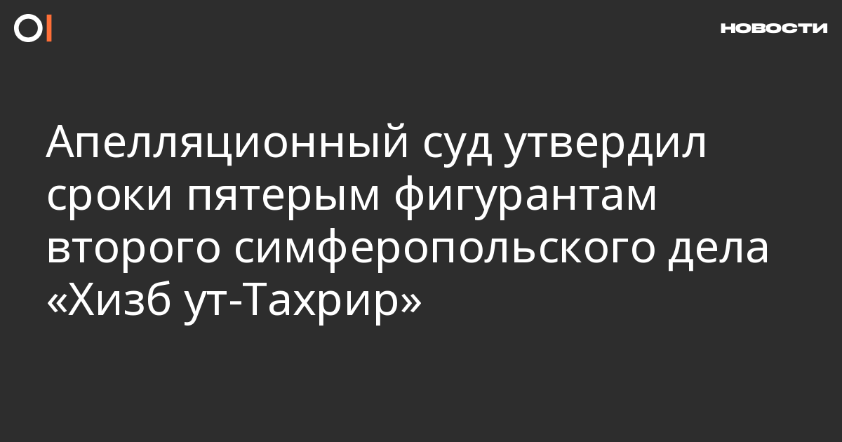 Апелляционный военный суд оставил без изменений приговор пятерым фигурантам второго симферопольского дела «Хизб ут-Тахрир» Рустему Шейхалиеву, Руслану Сулейманову, Осману Арифмеметову, Энверу Аметову и Яшару Муединову. Решение доступно на сайте суда.