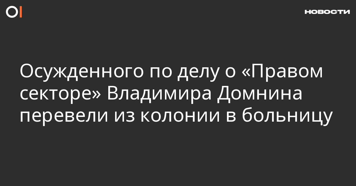 Осужденного на девять лет колонии по делу об участии в «Правом секторе» Владимира Домнина 14 февраля перевели из ИК-3 в Угличе в больницу в Рыбинске из-за обострившихся заболеваний. Об этом со ссылкой на его супругу сообщает проект «Поддержка политзаключенных. Мемориал».