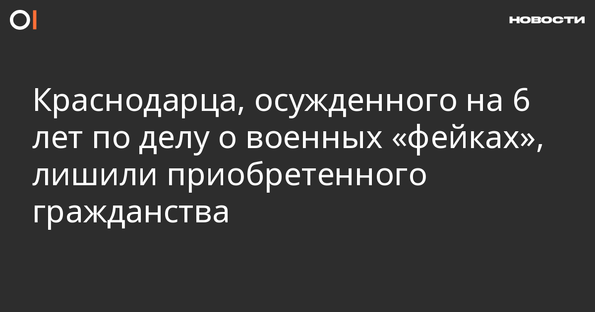 Краснодарца Александра Сомрякова, отбывающего шестилетний срок по делу о распространении «фейков» про российскую армию, лишили приобретенного гражданства России. Об этом в своем телеграм-канале сообщает проект «Политзек-ИНФО».