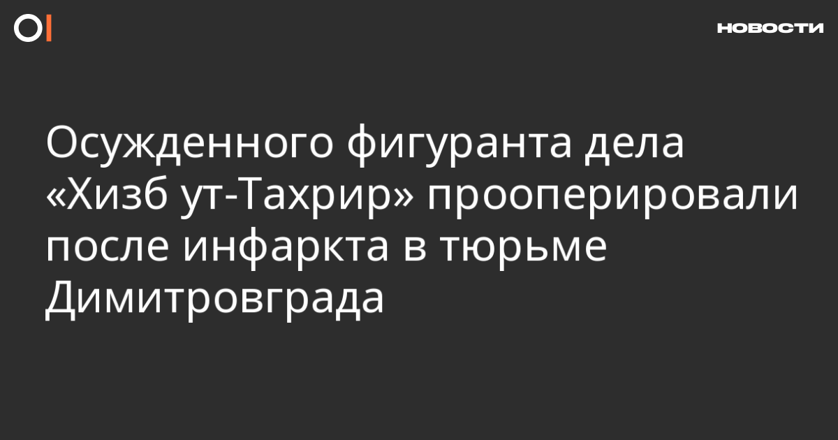 Осужденного на тринадцать лет лишения свободы по делу «Хизб ут-Тахрир» Рустема Сеитмеметова прооперировали после инфаркта миокарда в тюрьме Димитровграда. Об этом пишет «Крымская солидарность» со ссылкой на его жену Зеру Сеитмеметову.