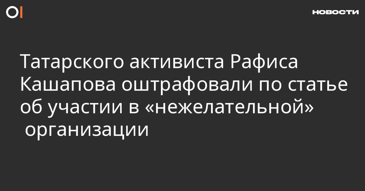 Набережночелнинский городской суд заочно оштрафовал татарского активиста, бывшего руководителя ВТОЦ Рафиса Кашапова на 15 тысяч рублей, признав виновным по статье об участии в «нежелательной» организации (20.33 КоАП). Об этом сообщает издание chelny-biz.ru, соответствующая карточка есть и на сайте суда.