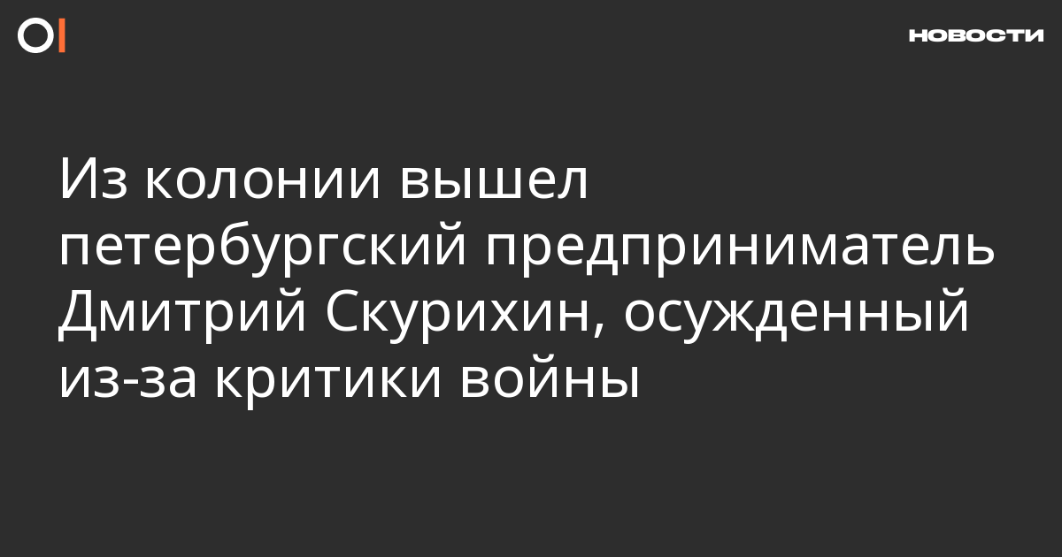 Из колонии на свободу вышел предприниматель из Ленинградской области Дмитрий Скурихин, который отбывал в ИК-5 наказание по делу о повторной «дискредитации» армии. Об этом сообщает «Бумага».