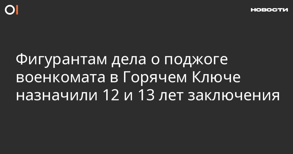 Южный окружной военный суд приговорил подозреваемых в поджоге военкомата в Горячем Ключе Бориса Гончаренко к 12 годам заключения, Богдана Абдурахманова — к 13 годам лишения свободы. Об этом сообщает «Зона солидарности».