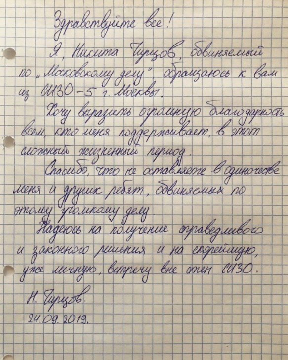 Я, Никита Чирцов, обвиняемый по „Московскому делу“, обращаюсь к вам из СИЗО — 5 г. Москвы.