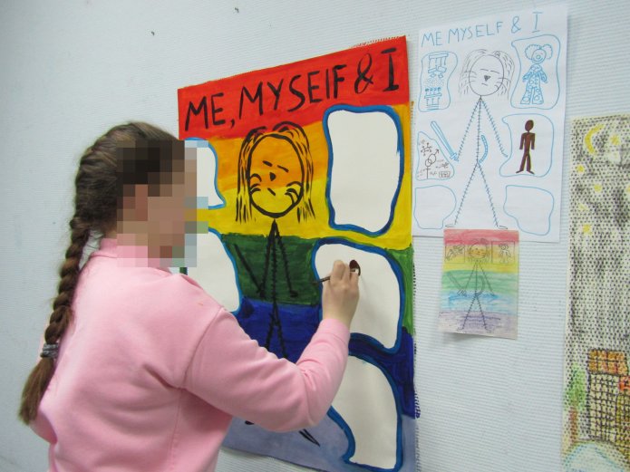 Он задавал ей какие-то дичайшие вопросы. Например, за два года до этих событий у нас был мастер-класс, мы рисовали в кабинете на огромных листах себя, каждый себя. Называлась тема «Я большая». Юля придумала эту историю, потому что очень многие люди очень боятся рисовать на больших листах. Нам кажется, что мы недостойны большой бумаги. И вот одна девочка, на тот момент ей было лет 12, нарисовала себя как палочного человечка на фоне радуги. В общем, ни у кого не вызвало вопросов, и мы про эту историю забыли.Капитан Тычинский показывает серый скриншот этой вот картинки. Юля лихорадочно вспоминает — а что там-то? А там такой черный палочный человечек, то есть голова кругленькая, ручки-ножки и полосочки разного серого цвета. И вот за эту картинку, например, очень долго он прессовал.