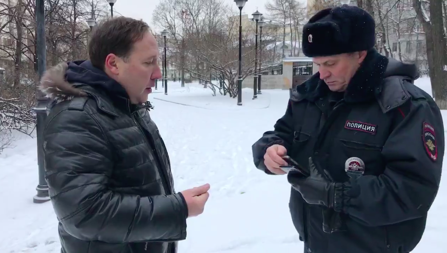 Недалеко от Лермонтовского сквера полиция задержала Александра Брусенцева, когда он пытался достать дрон: по его словам, за ним следили в метро.