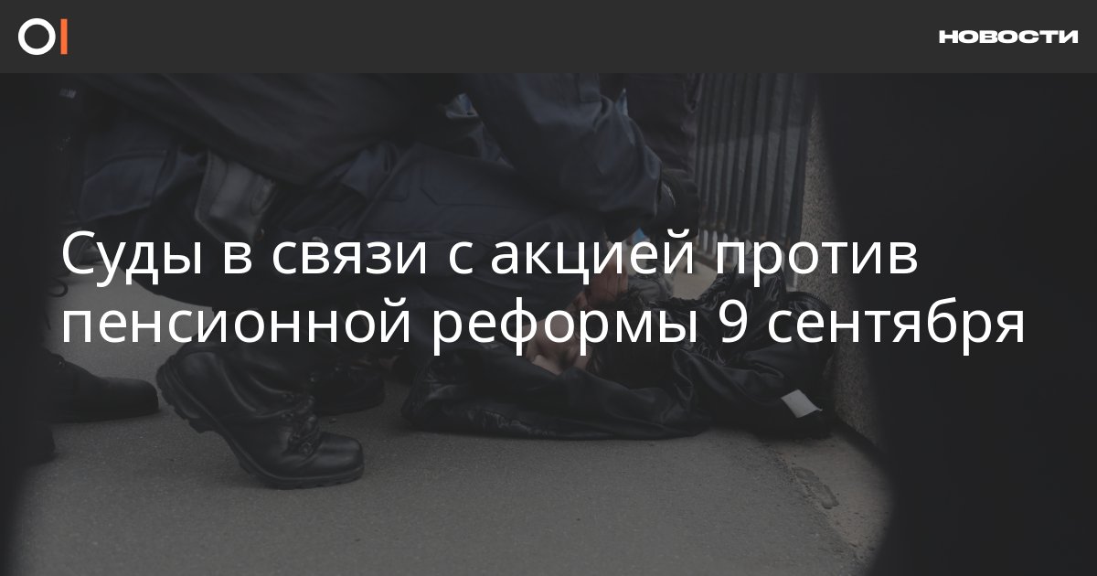 9 сентября во многих городах страны прошли митинги и шествия против повышения пенсионного возраста, двенадцать из которых были согласованы с властями. По данным ОВД-Инфо, задержали более 1018 человек, больше всего в Санкт-Петербурге — порядка 452 участников акции. С 10 сентября суды начали активно рассматривать административные дела задержанных.