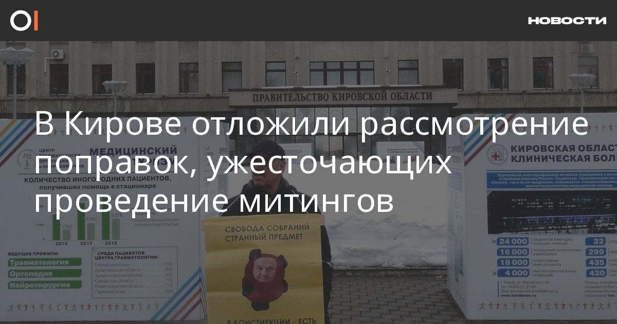 Заксобрание Кировской области 28 марта отложило рассмотрение поправок, которые ужесточают правила организации и проведения публичных мероприятий в регионе. ОВД-Инфо разбирался, что это за поправки, и почему законодатели приняли такое решение.