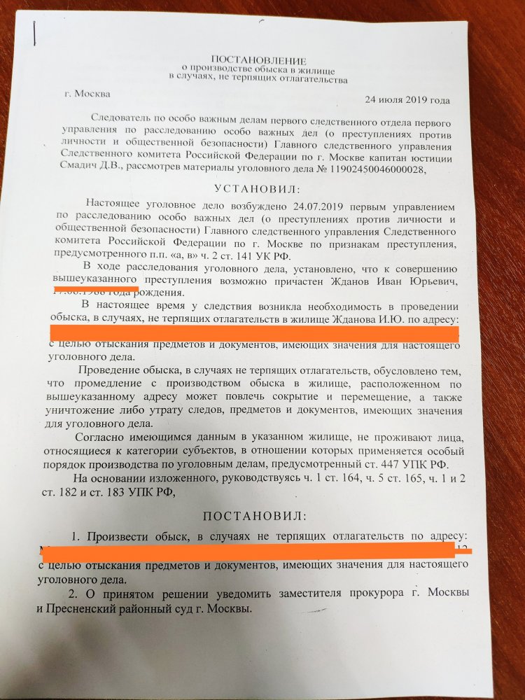 В постановлении на обыск, который опубликовал адвокат ФБК Владимир Воронин, сказано, что Жданов может быть причастен к совершению преступления, предусмотренного ч. 2 ст. 141 УК.
